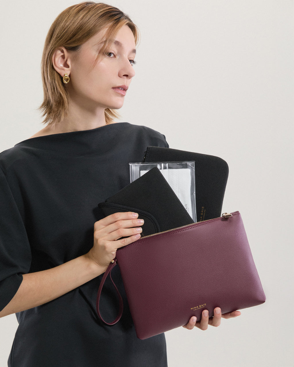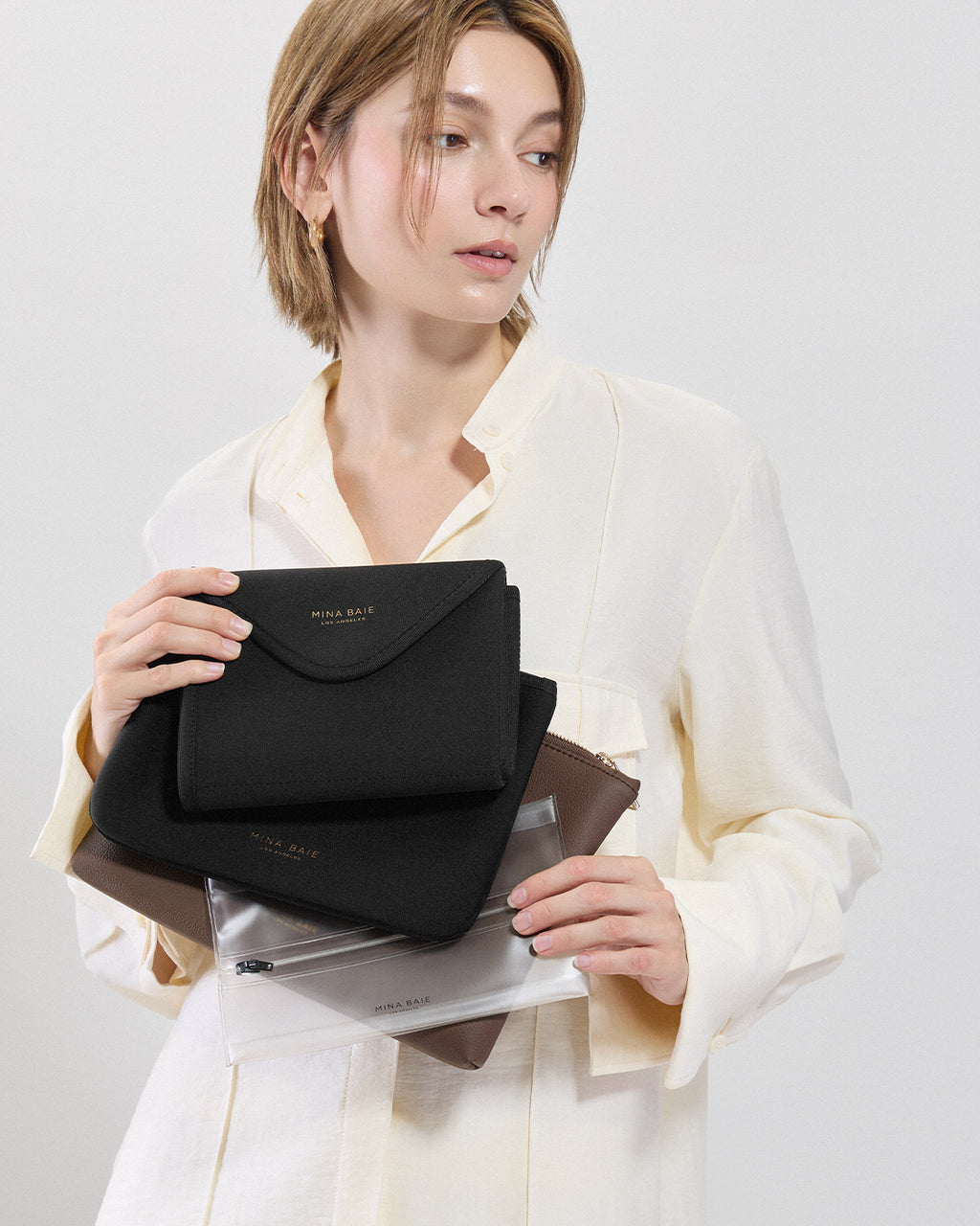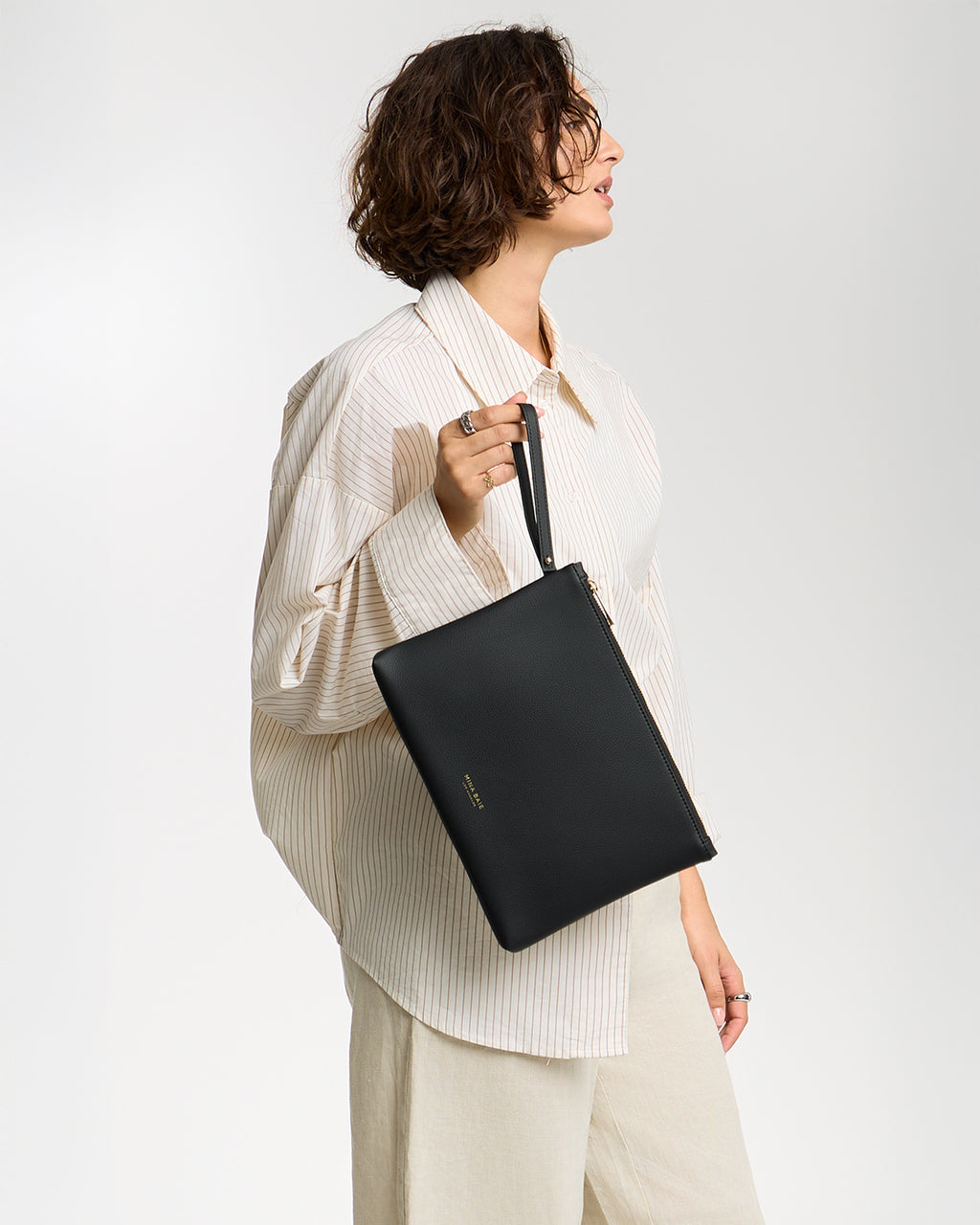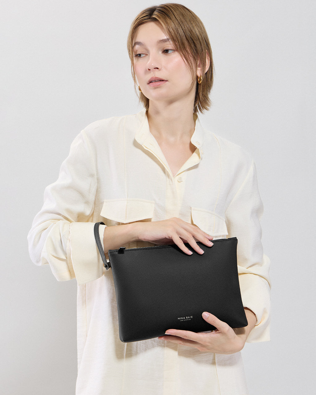 - Microfiber vegan leather pouch/wristlet with light-gold or matte black hardware
