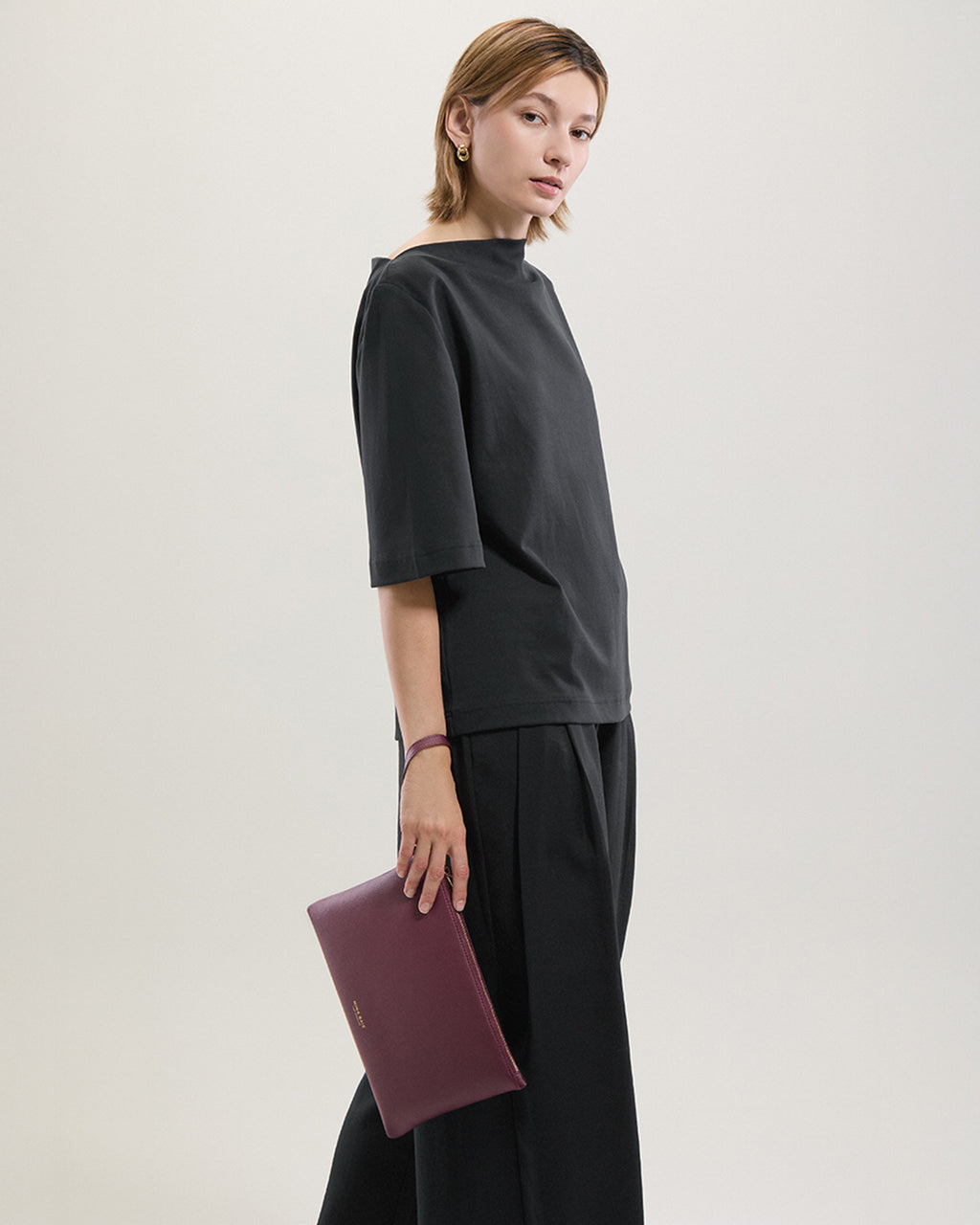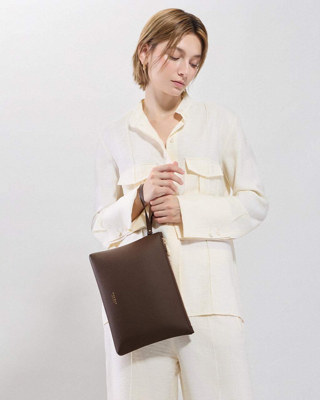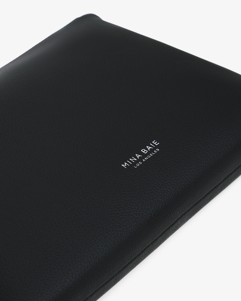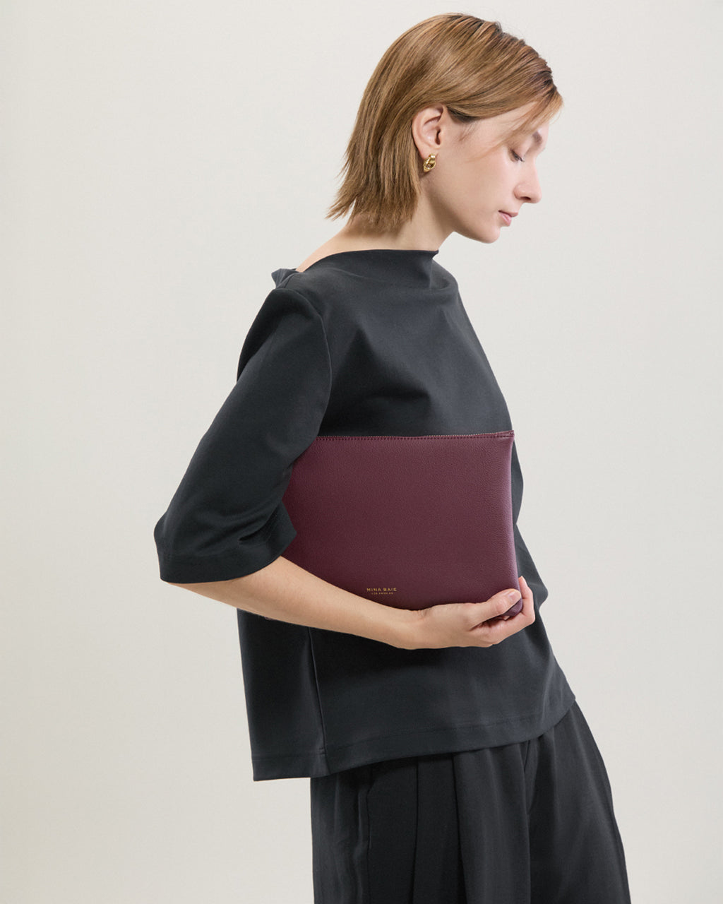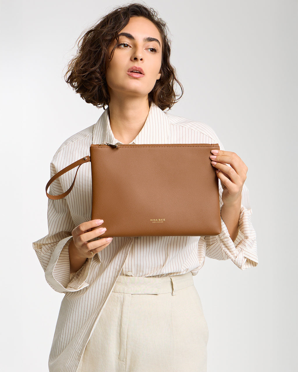 - Microfiber vegan leather pouch/wristlet with light-gold or matte black hardware