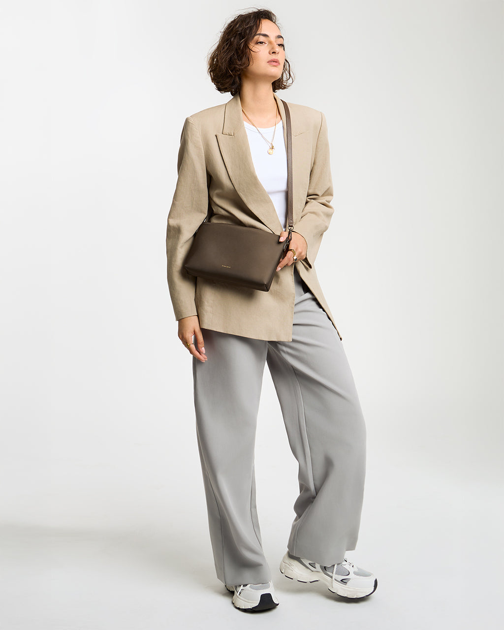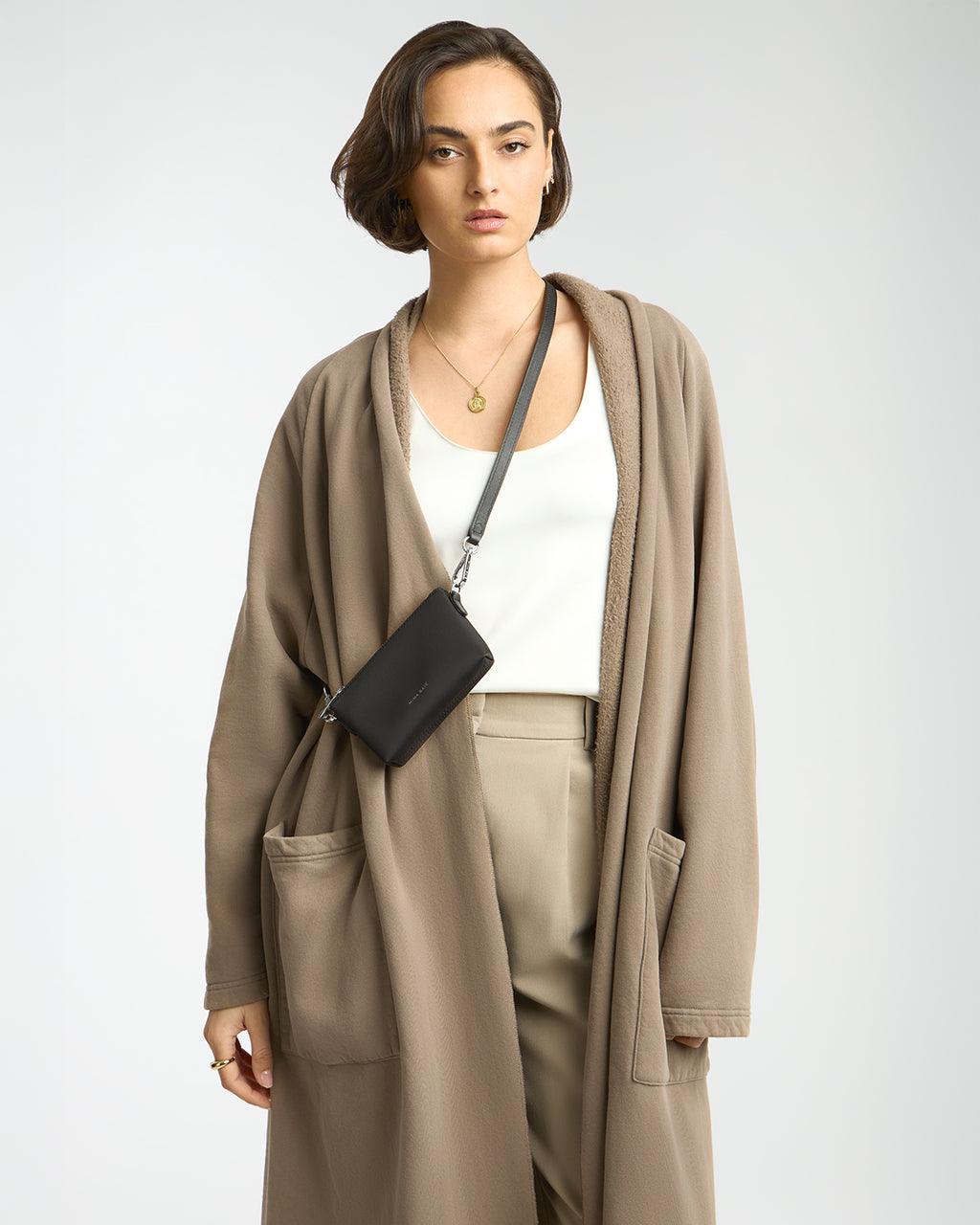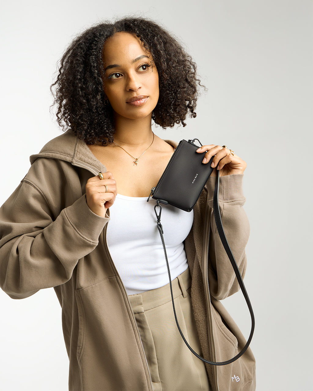 - Includes non-adjustable crossbody strap