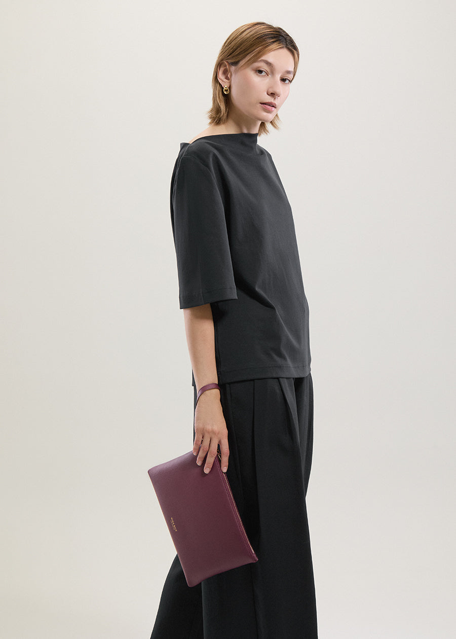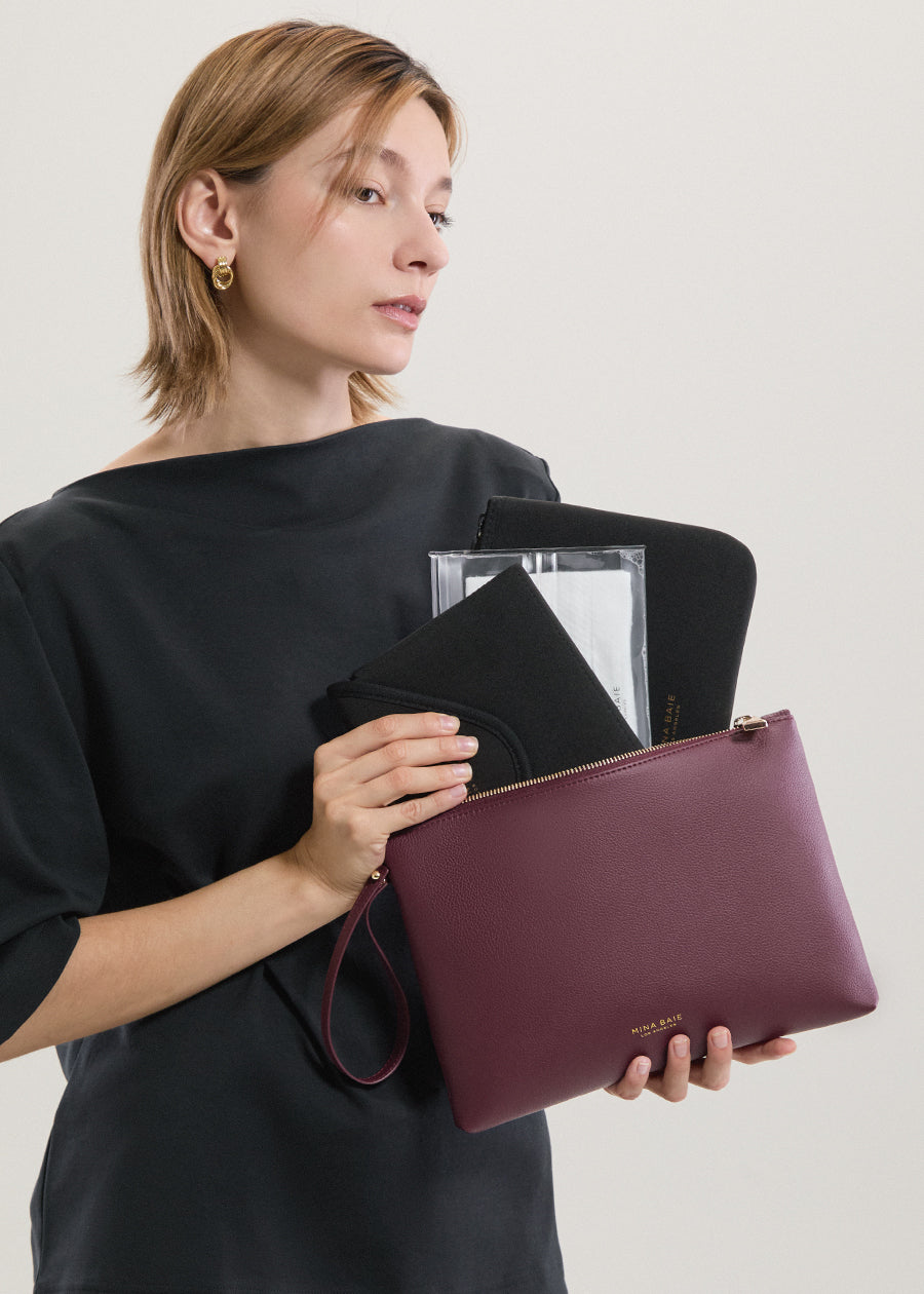 - Microfiber vegan leather pouch/wristlet with light-gold or matte black hardware